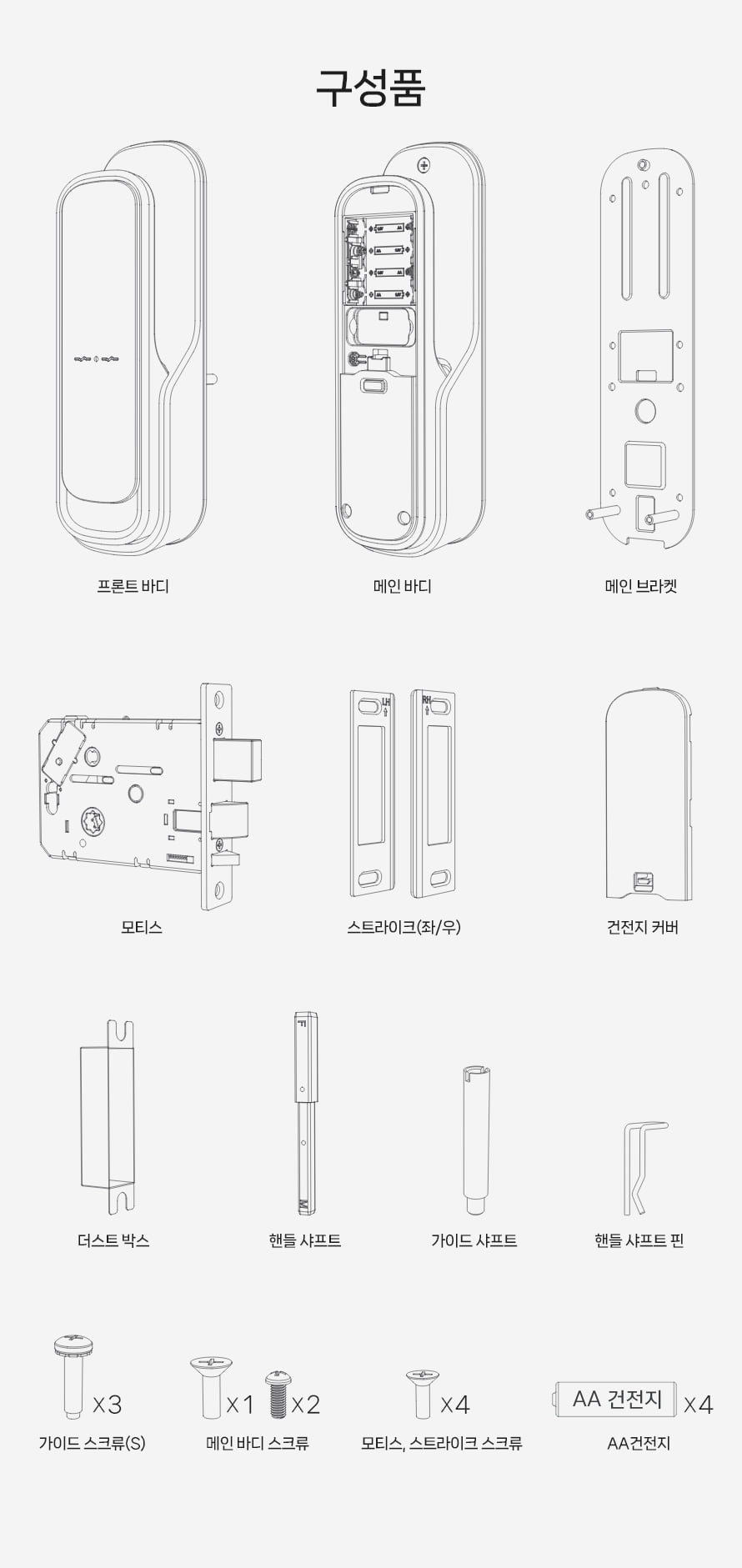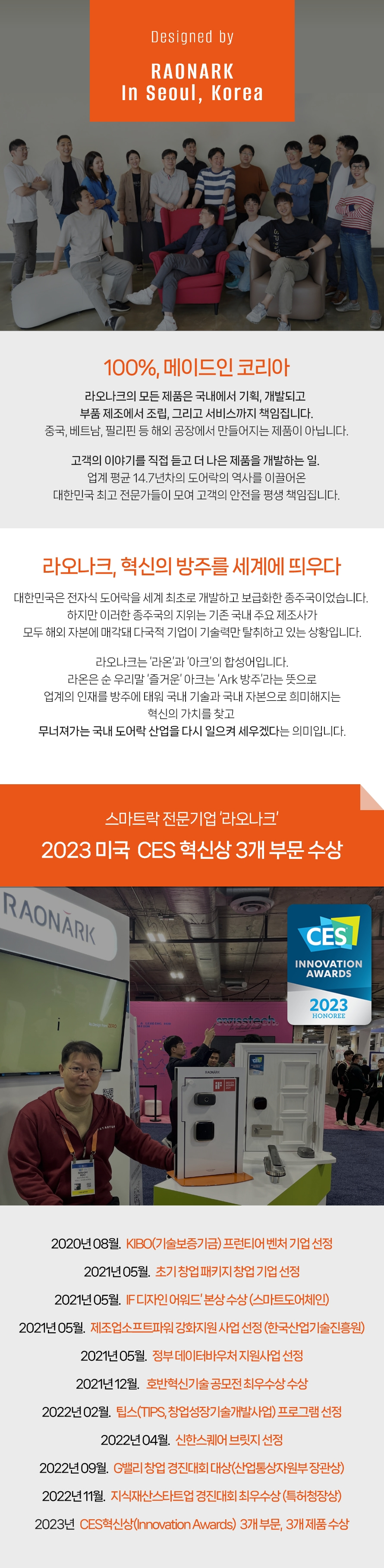 주요 특징: 키리스 엔트리, 쉬운 설치, 듀얼 핸들, 세련된 디자인. 보안: 도난 방지 PIN, 도난 경고, EMP 저항, 강제 잠금, 화재 대응, 자동 잠금, 임시 PIN, 비상 충전.