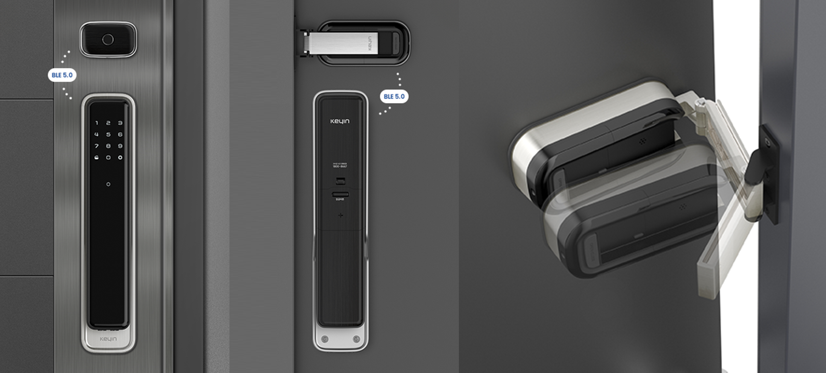One example is KeyinE, the Plus LOCK. Door lock ensures security when the door is closed. But what happens when the door opens? There are numerous occasions when you have to open the door unprotected. Our Creative Lab came up with a solution in which security is still enabled even when the door is opened.