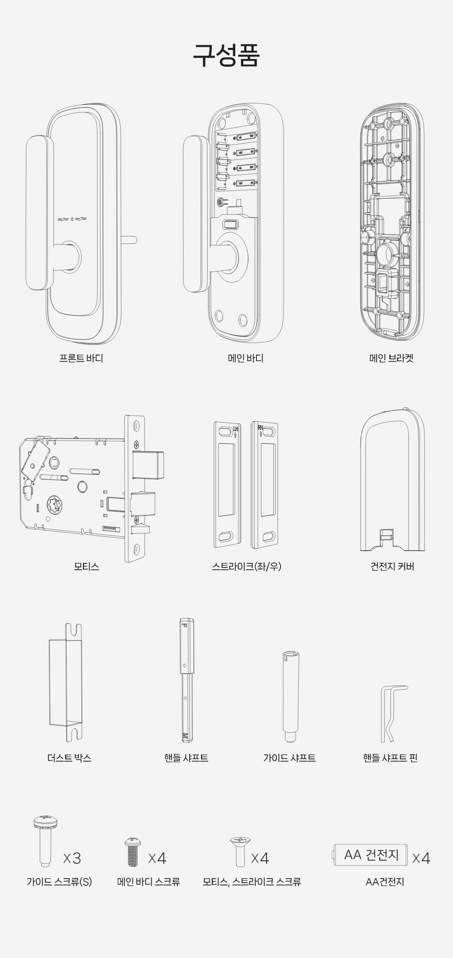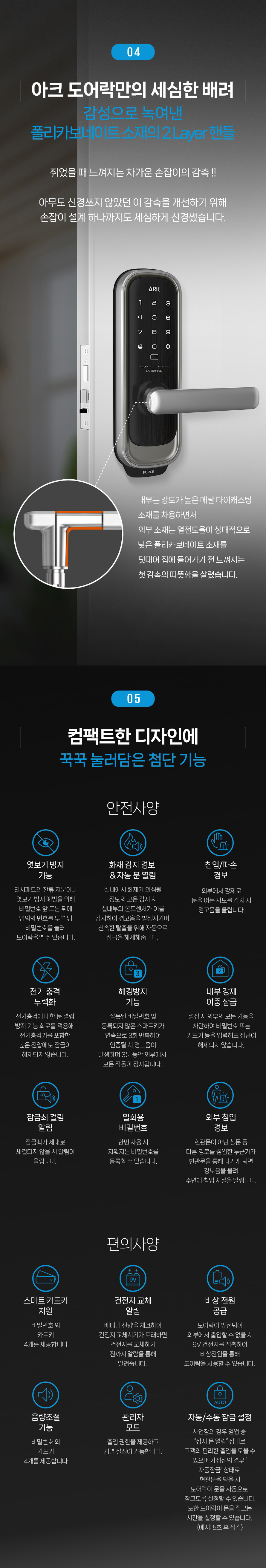 주요 특징: 키리스 엔트리, 쉬운 설치, 듀얼 핸들, 세련된 디자인. 보안: 도난 방지 PIN, 도난 경고, EMP 저항, 강제 잠금, 화재 대응, 자동 잠금, 임시 PIN, 비상 충전.