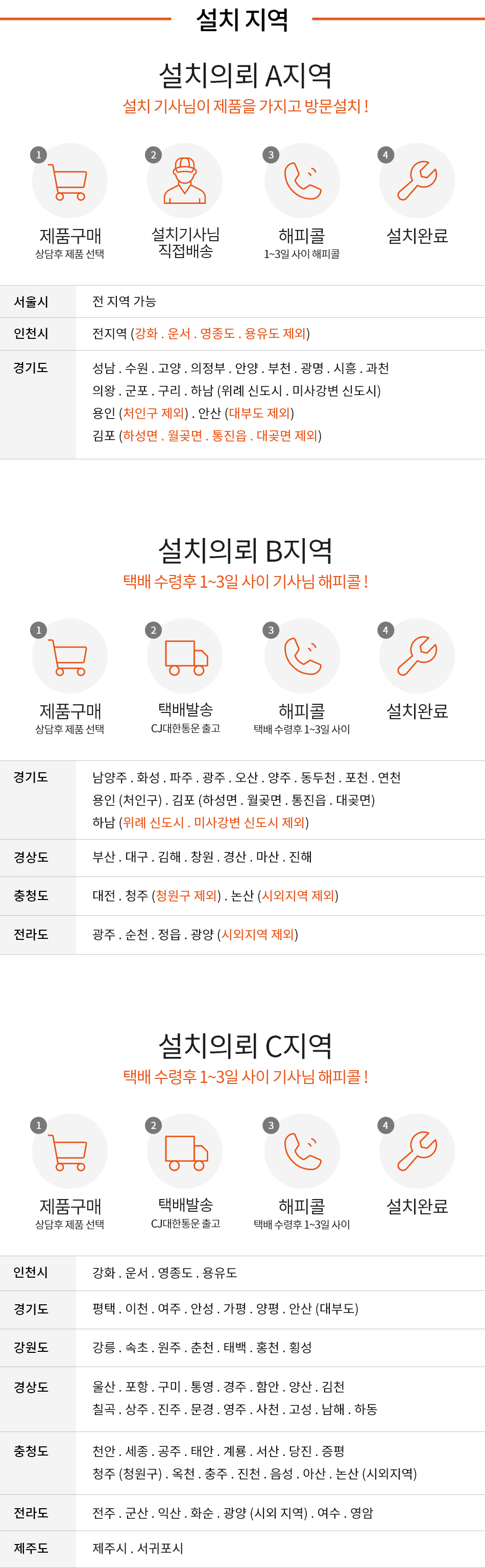 1. 상세페이지 하단의 설치 지역, 별도 추가 비용, 설치 가능 여부를 반드시 체크해주세요.