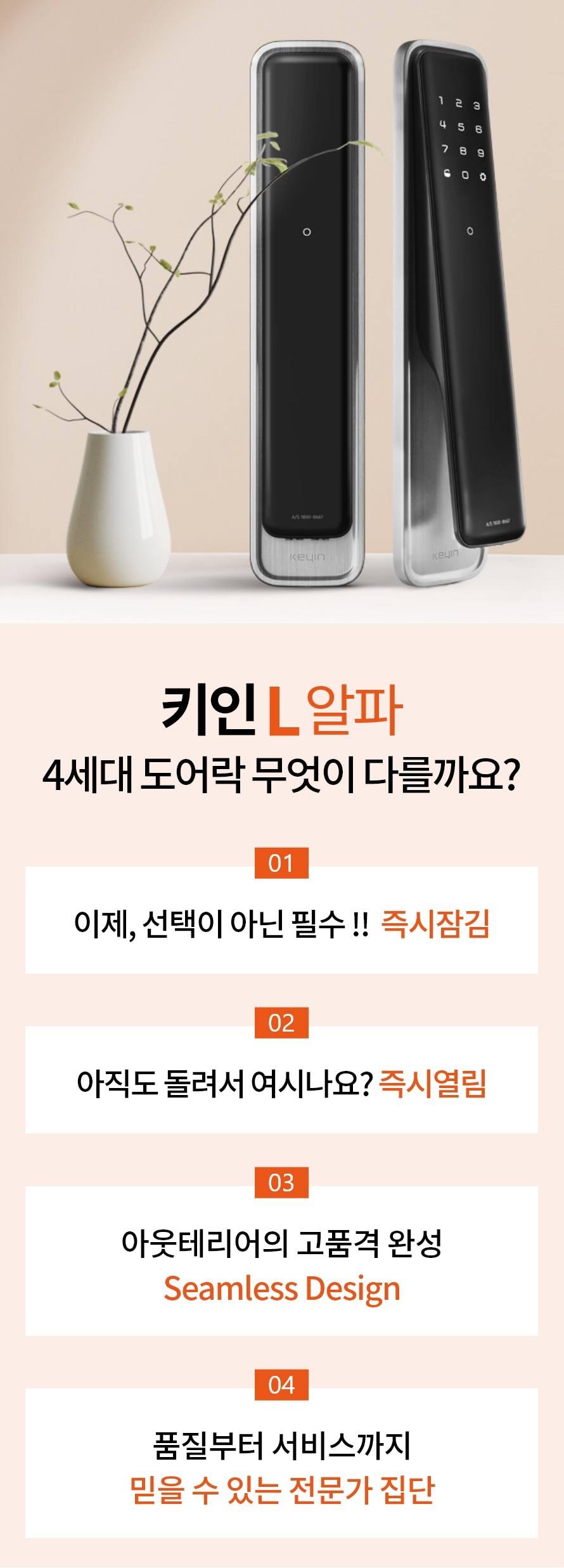 Keyin L 알파 스마트 도어 잠금 장치는 모바일 앱, 지문 인식 및 비밀번호 시스템을 사용하여 키리스 엔트리를 제공합니다. 세련된 디자인은 현대 생활의 보안과 편의성을 향상시킵니다.