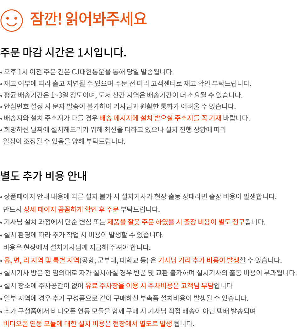 1. 상세페이지 하단의 설치 지역, 별도 추가 비용, 설치 가능 여부를 반드시 체크해주세요.
