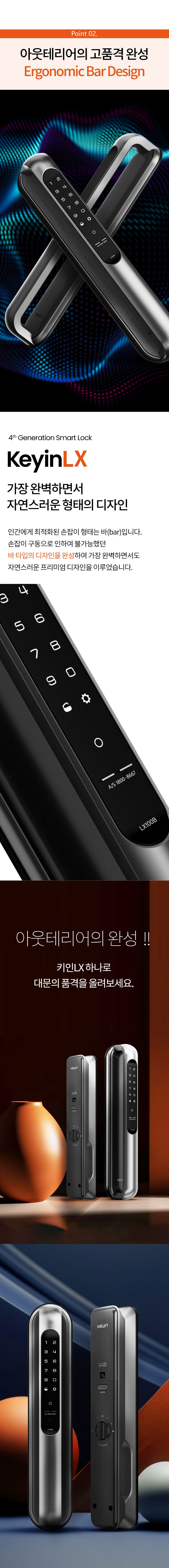Keyin LX 도어록은 즉시잠김에서 한발짝 더 나아가서 가장 직관적인 바 형태의 완벽한 디자인을 적용하였습니다. 한번 설치한 이후에도 고객의 취향에 맞춰 IoT 연결, 안면인식 확장이 가능한 진정한 스마트도어락입니다.